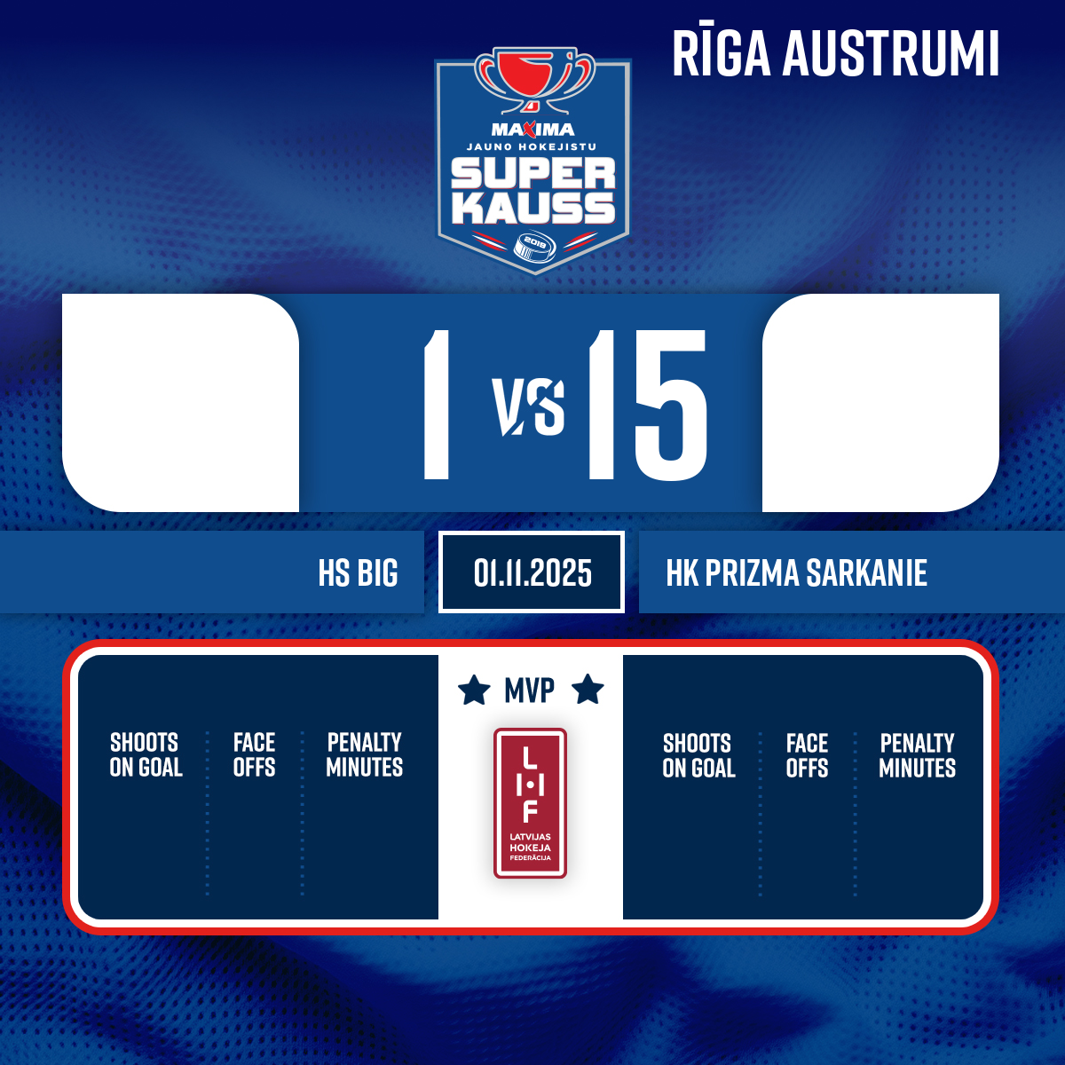 Goal#12 Miķelis LAUCIŅŠAssists: #19 Didzis BERGMANIS, #27 Renārs BĀNIS - 24:00 Start of the 3rd period