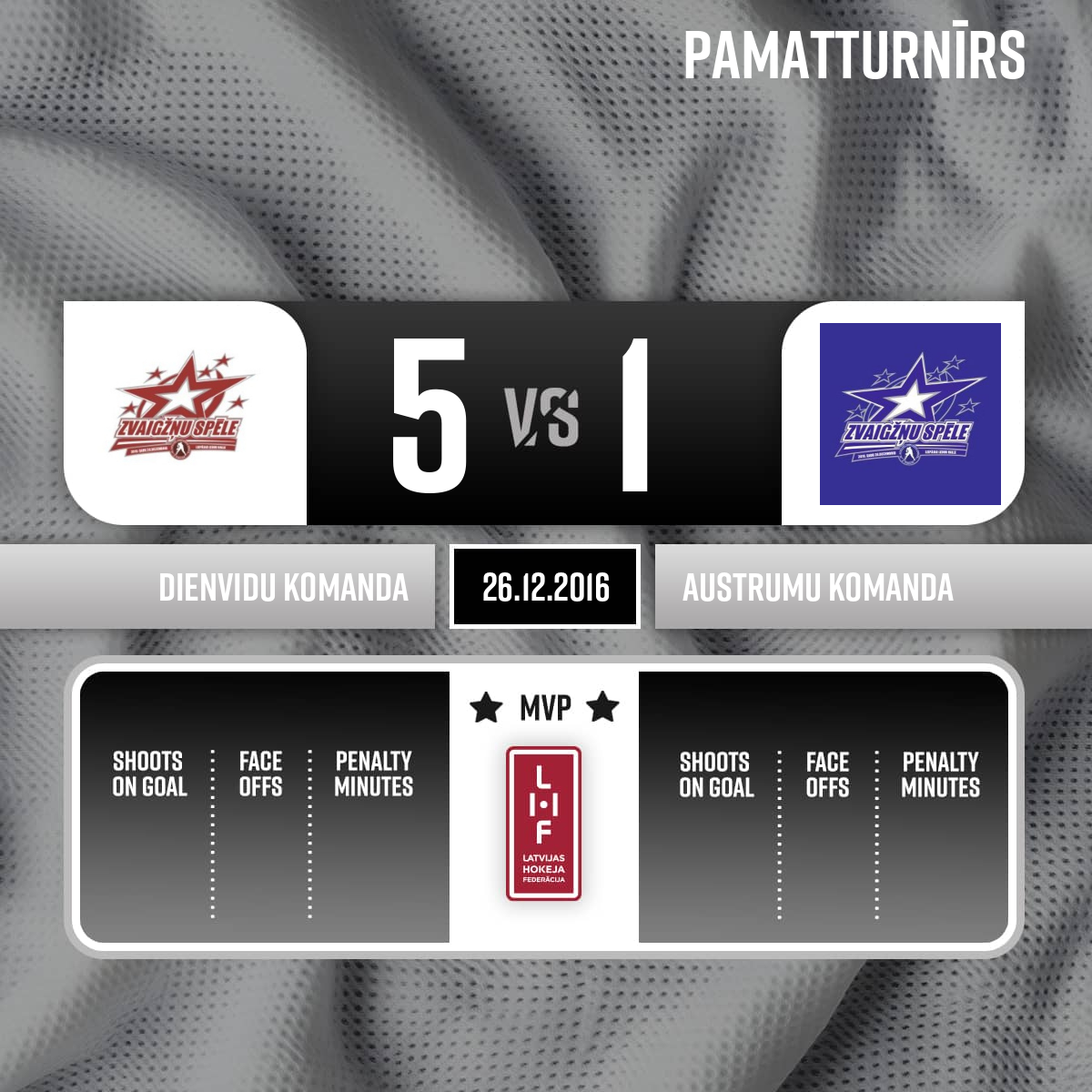 - 12:00P2Spēle beigusies un ar rezultātu 5:1 uzvaru izcīnīja Dienidu komanda Labākie spēlētāji: Dienvidu komandā Juris Bērziņš #2 un Austrumu komandā Mārtiņš Raitums #25