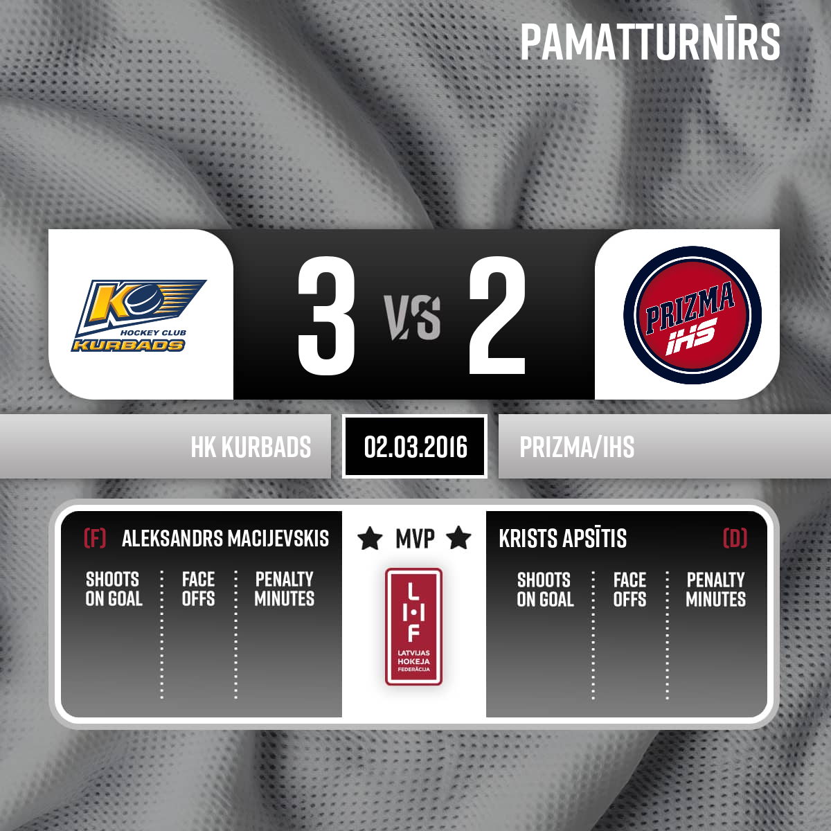 - 60:00P3Spēles labākie spēlētāji; HK Kurbads #17 Aleksandrs Macijevskis; HK Prizma #94 Krists Apsītis.