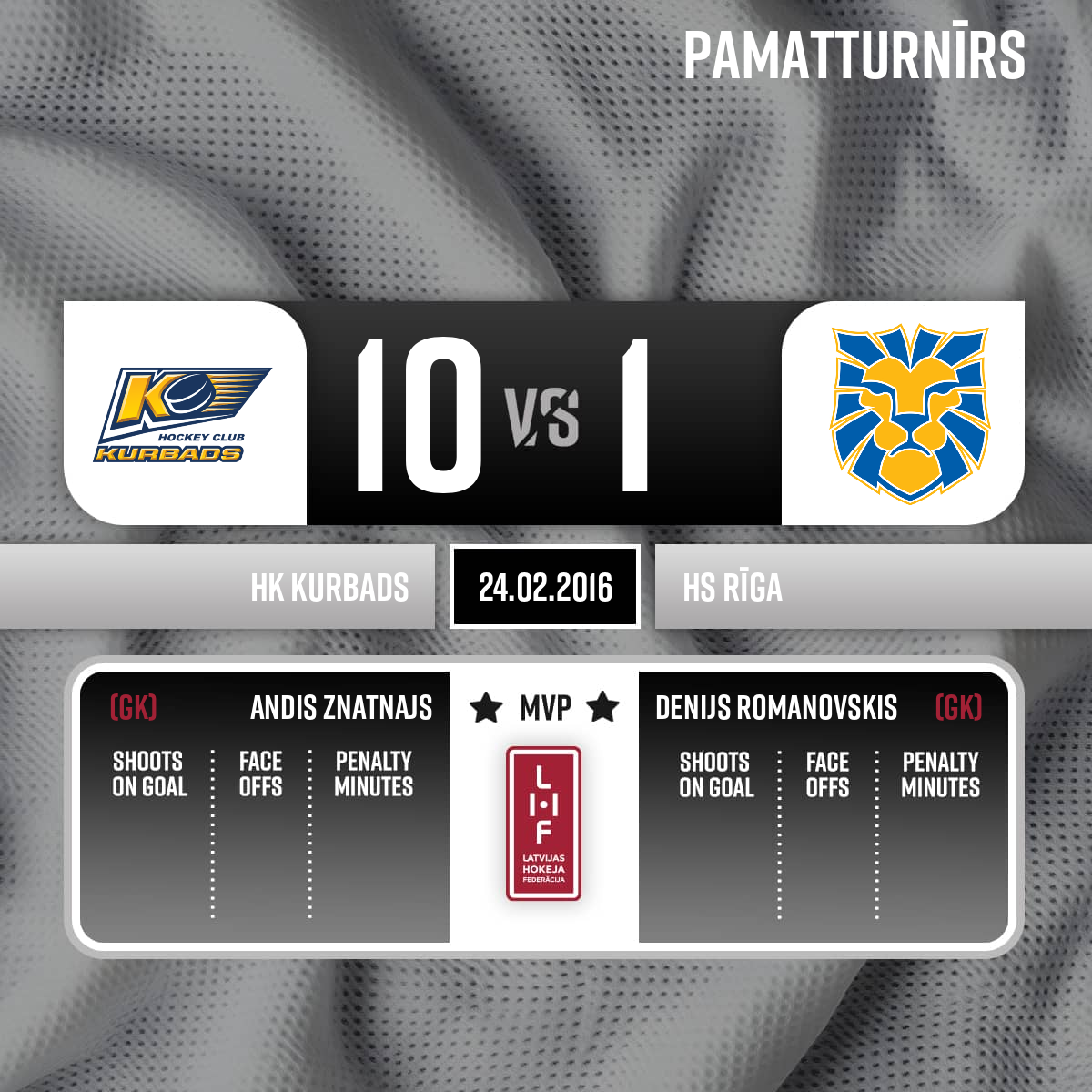 - 60:00P3Spēles labākie spēlētāji; HK Kurbads #43 Andis Znatnajs; HS Rīga #1 Denijs Romanovskis.