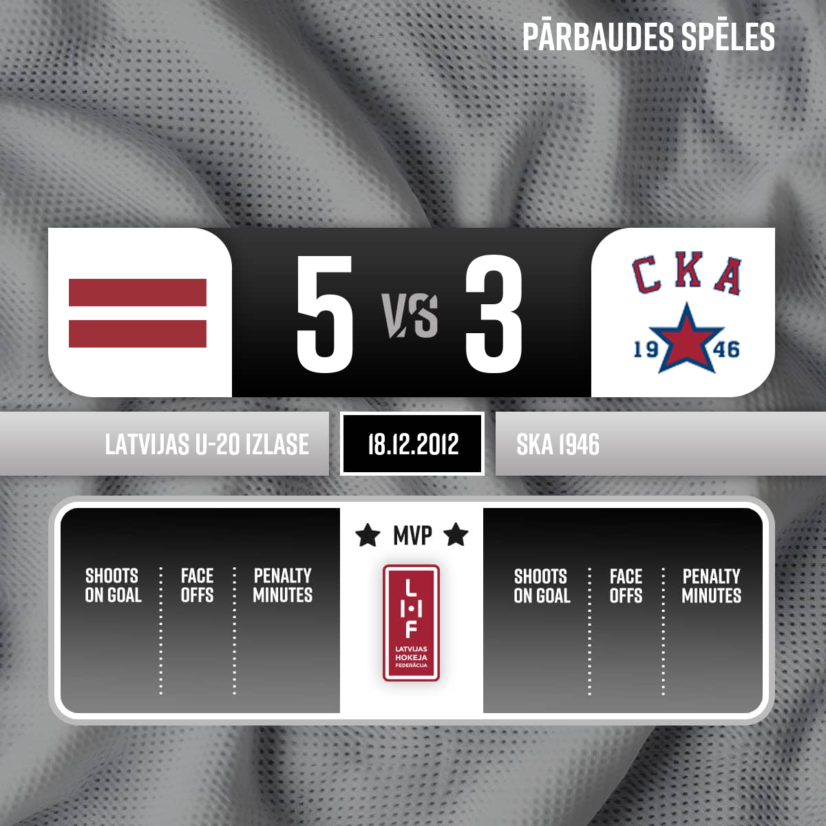 - 60:00P3Labākie spēlētāji LAT U-20 #11 - Martins Lavrovs un #8 - Edmunds Augstkalns, SKA 1946 komandā #88 - Egor Malenkikh un #94 - Alexandr Barabanov