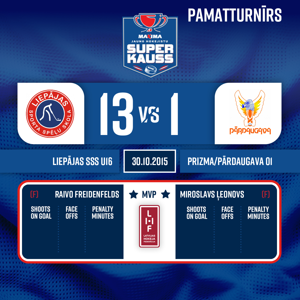 Powerplay goal#24 Matīss PETROVICSAssists: #7 Raivo FREIDENFELDS, #19 Ričards Rihards FOMINS - 04:17P1