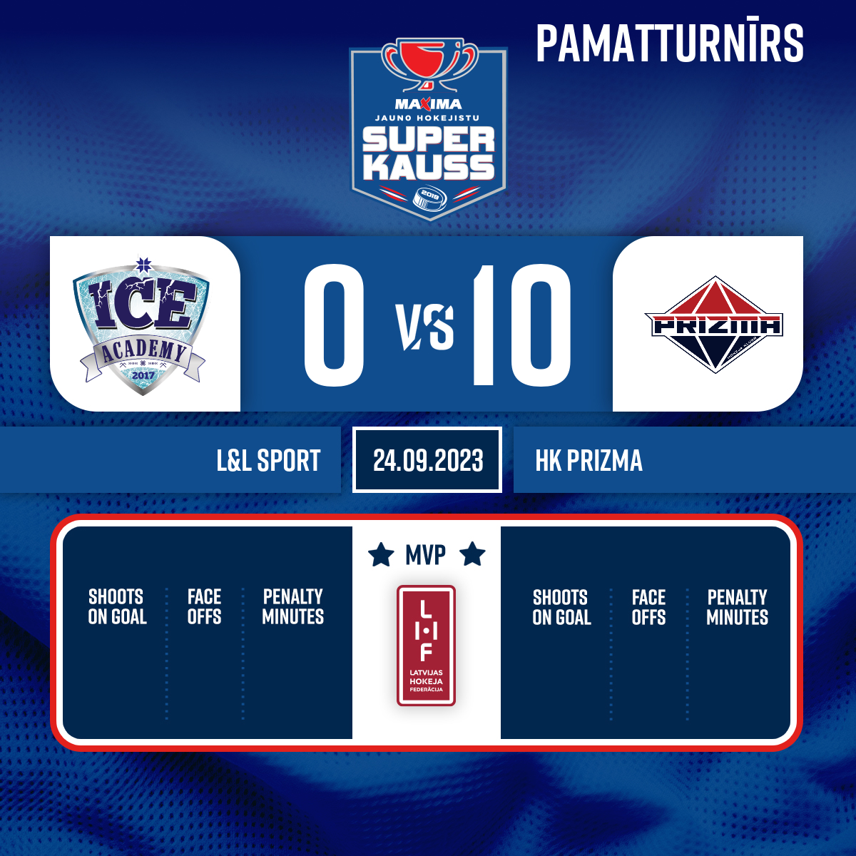 Powerplay goal#18 Markuss OĻEIŅIKOVSAssists: #9 Vitalii PUTIKOV, #15 Jefims GLĀZERS - 30:00 Start of the 3rd period