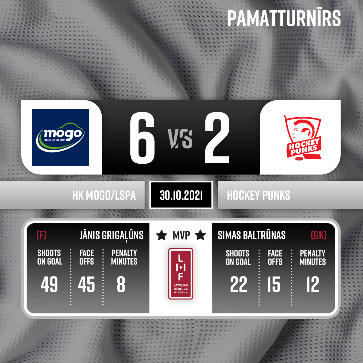 - 60:00P3Labākais spēlētājs Hockey Punks komandā nr. 95 Simas BALTRUNAS / Best player for team Hockey Punks number 95 Simas BALTRUNAS. Labākais spēlētājs HK Mogo/LSPA komandā nr. 11 Jānis GRIGAĻŪNS / Best player for team Mogo/LSPA number 11 Jānis GRIGAĻŪNS.