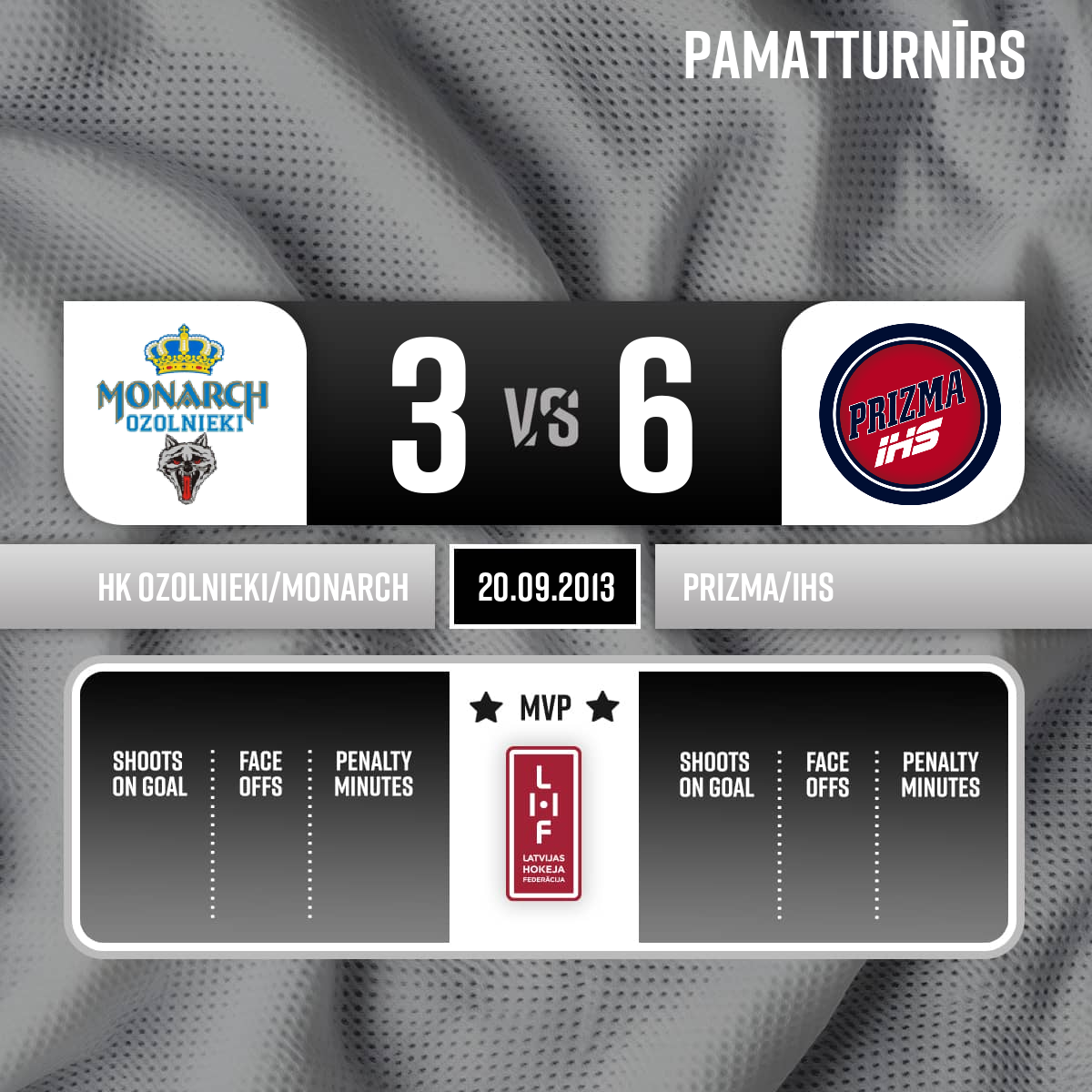 Goal#13 Viktors LOBAČEVSAssists: #93 Aleksandrs BABURINS, #20 Sergejs PEČURA - 00:00P1Galvenais tiesnesis - Elvijs Trankalis, līnitiesneši - Krišs Kupčus, Aigars Bumbieris