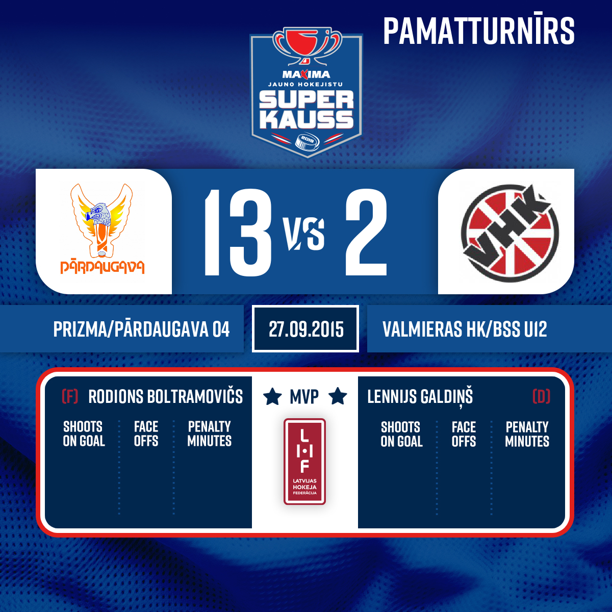 Powerplay goal#91 Kristers BUKŠSAssists: #33 Elvis LAŠKOVS, #88 Toms TROCKIS - 12:07P1