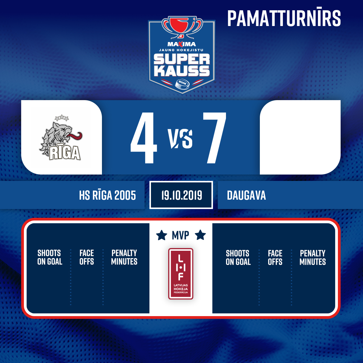 Goal#8 Rinalds KUBULIŅŠAssist: #18 Kevins PĒTERSONS - 00:00P1Goalkeeper in#30 Marks REZANOVIČS