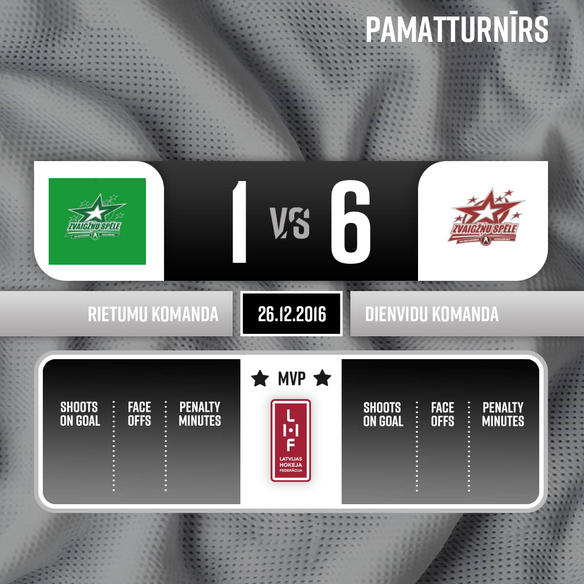 - 12:00P2Spēle beigusies ar rezultātu 6:1 kur uzvaru izcīnīja Dienvidu komanda. Labākie spēlētāji: Dienvidu komandā - Romāns Ņekļudovs #15 Rietumu komandā Kārlis Ozoliņš #25