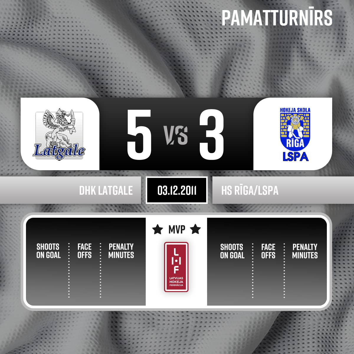 Powerplay goal#12 Jānis LAZDĀNSAssists: #9 Deniss MARTJUŠOVS, #11 Sandis VIRKSTENISVairākumā +1 - 57:08P3