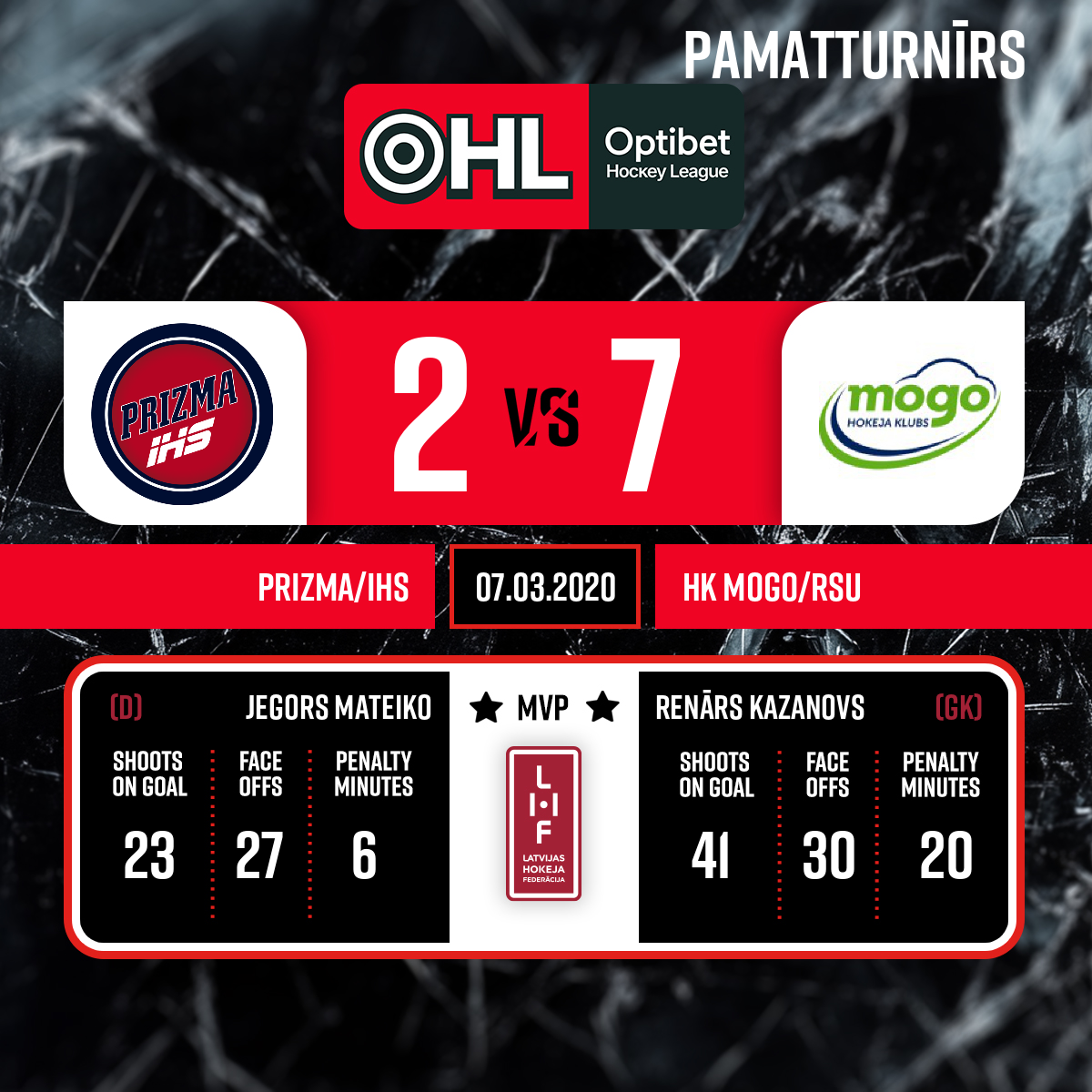Labākie spēlētāji: Prizma/IHS - #25 Jegors MATEIKO HK Mogo - #27 Renārs KAZANOVS