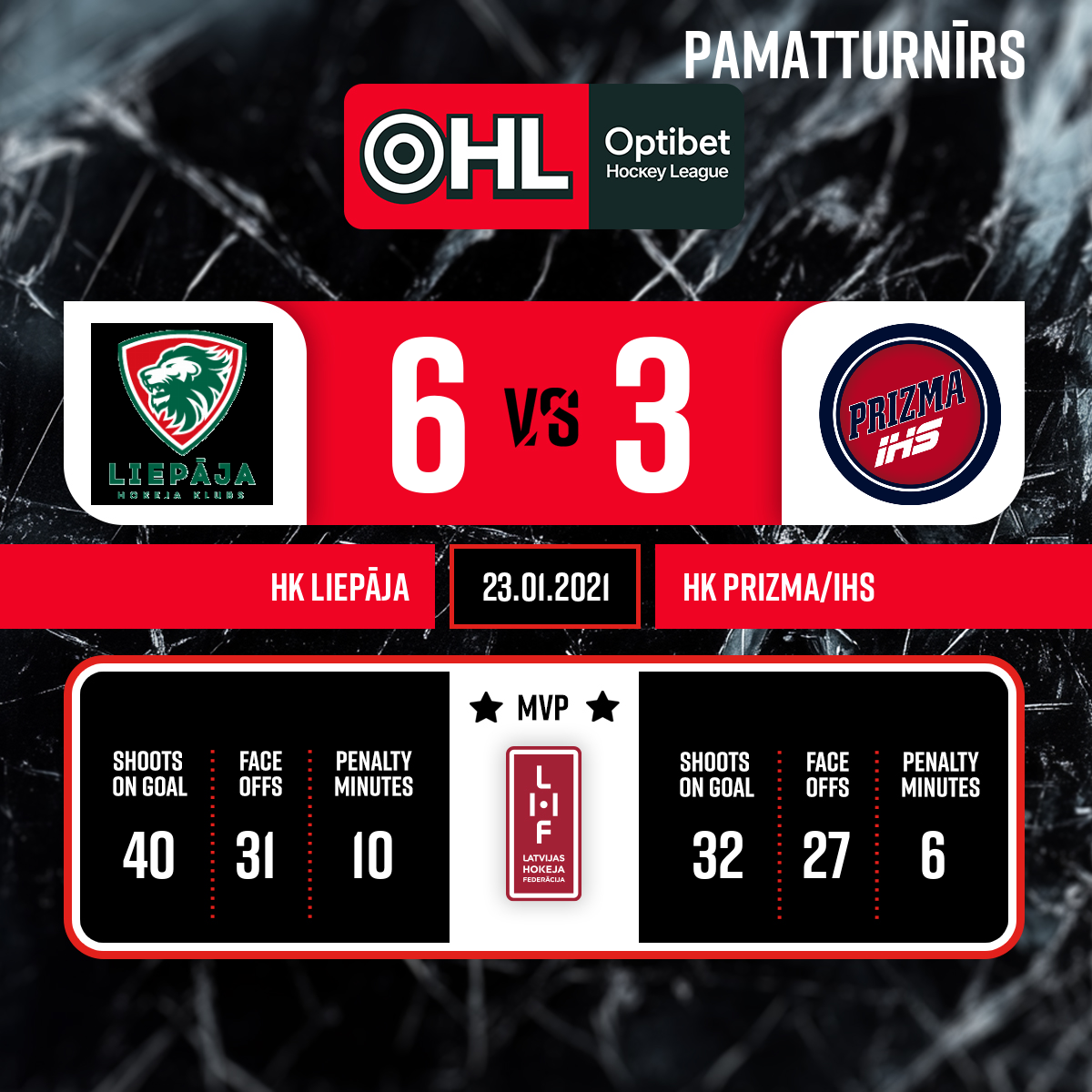 Spēles labākie spēlētāji- HK Liepāja nr.74 Lubys Laurynas HK Prizma/IHS nr.28 Rihards Krastiņš