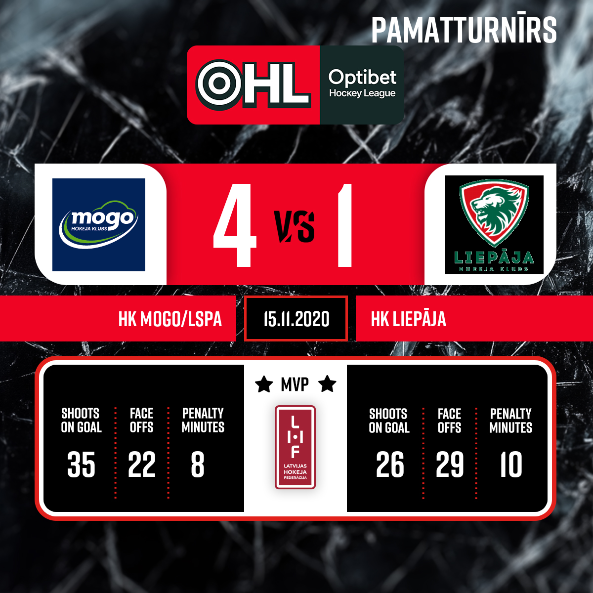 Spēles labākie spēlētāji- HK Mogo/LSPA- Nr 30 ŠILOVS Artūrs HK Liepāja- Nr 11 MAZURS-MAGO Linards