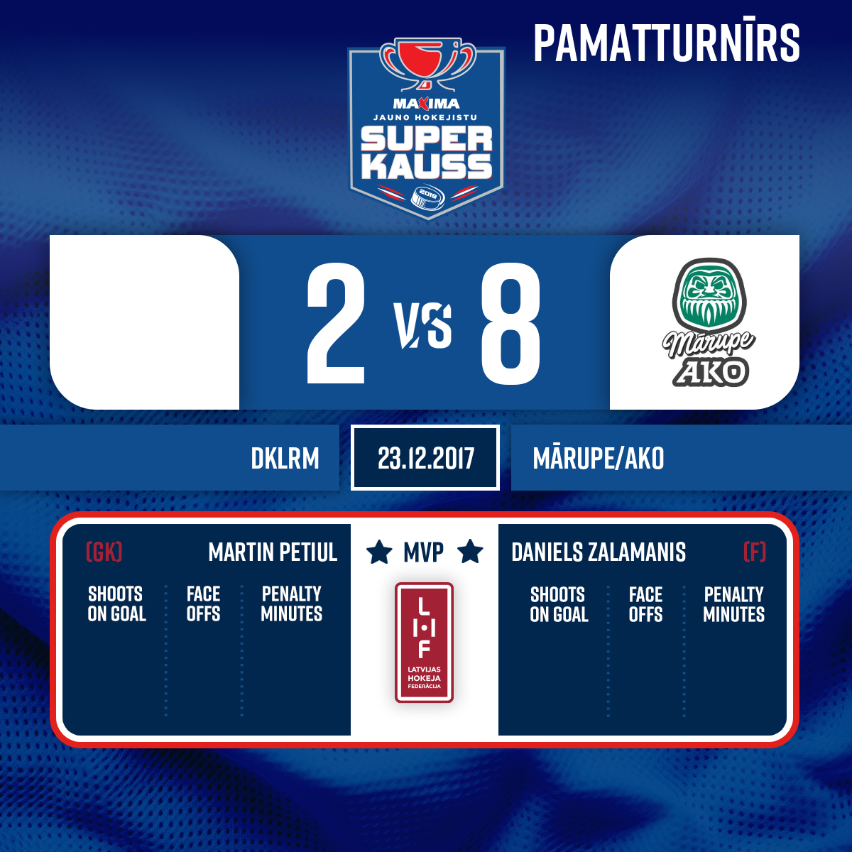 Vārti#11 Andrejs BĒRZIŅŠPiespēle: #29 Aleksandrs FRĪDENBERGS - 00:001.PVārtsargs stājas vārtos#1 Martin PETIUL