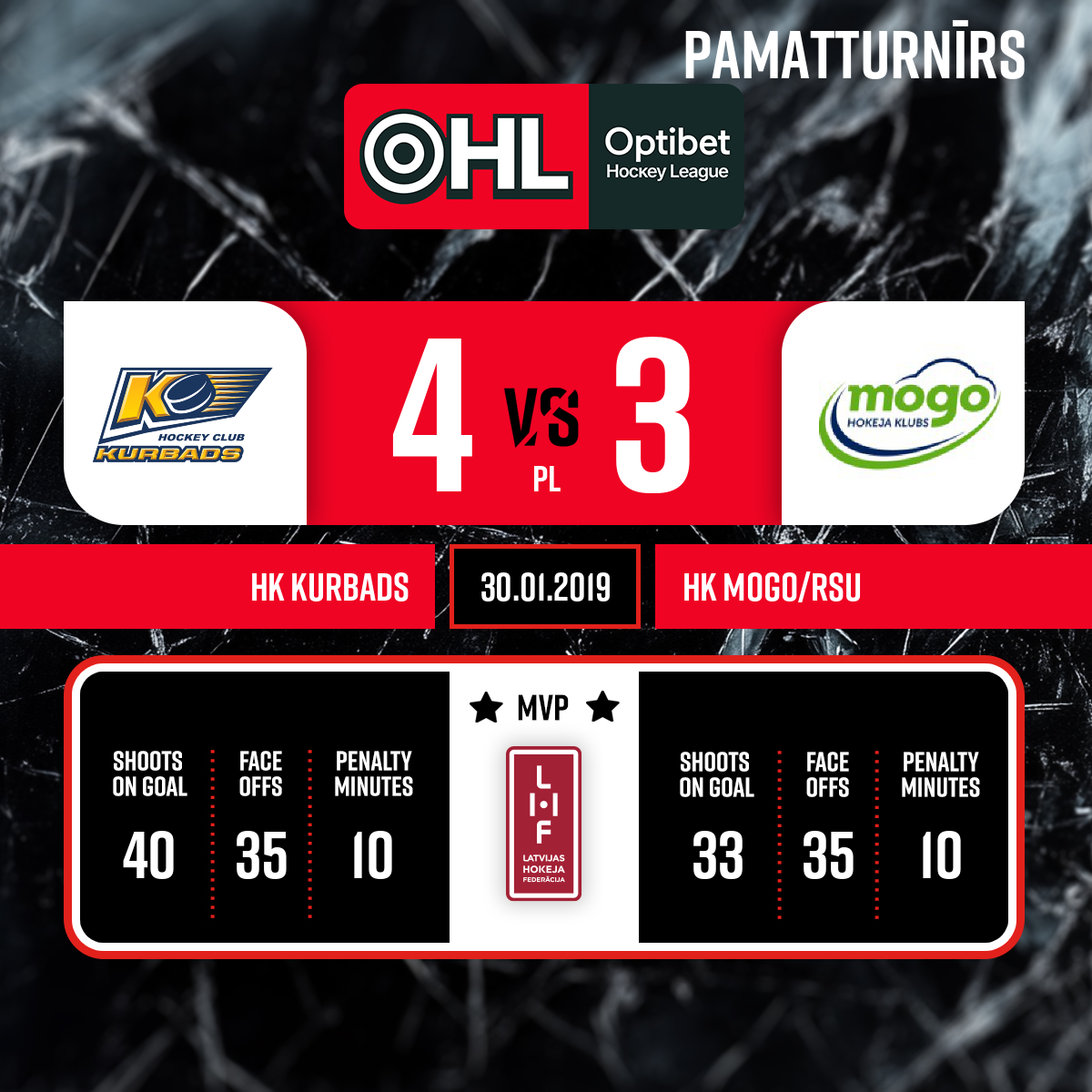 - 61:39PLLabākais spēlētājs- HK Kurbads- Nr 81 PUSHKARYOV Konstantin HK Mogo- Nr 22 SIKSNIS Andris