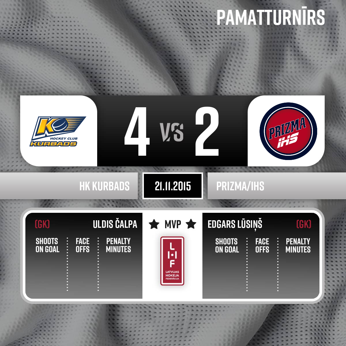 - 60:003.PSpēles labākie spēlētāji; HK Kurbads #30 Uldis Čalpa; HK Prizma #33 Edgars Lūsiņš.