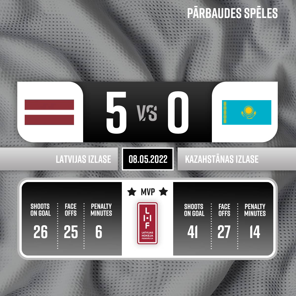 - 60:003.PLabākais spēlētājs Latvijas izlasē- Nr.31 Artūrs Šilovs Labākais spēlētājs Kazahstānas izlasē- Nr.6 Leonid Metalnikov