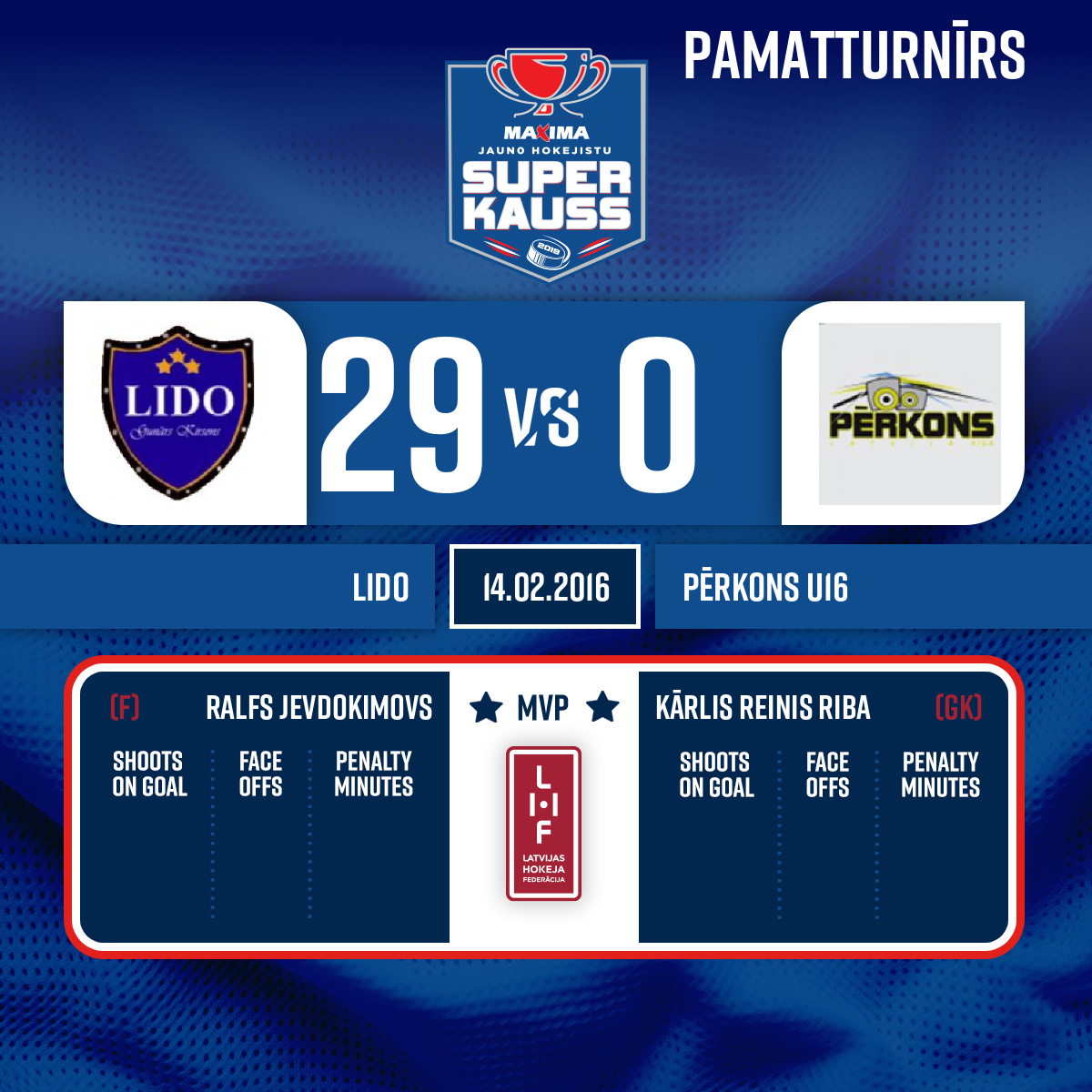 Vārti#16 Miks TUMĀNOVSPiespēles: #23 Ralfs JEVDOKIMOVS, #28 Gustavs MILLERS