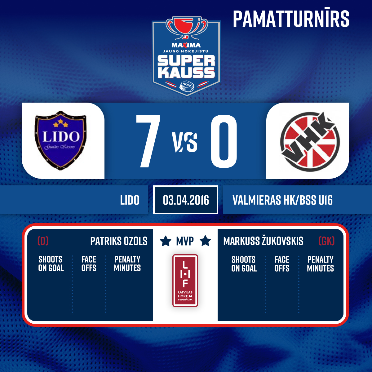 Vārti#16 Miks TUMĀNOVSPiespēles: #66 Arsenijs PASTORS, #46 Ernests OZOLS