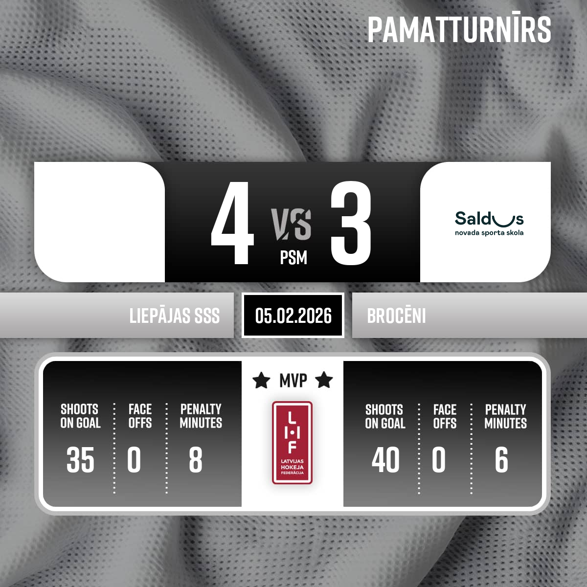 Vārti#47 Rūdolfs LAIVENIEKSPiespēles: #4 Kristians BĒRZIŅŠ, #45 Kristers BUTĀNS