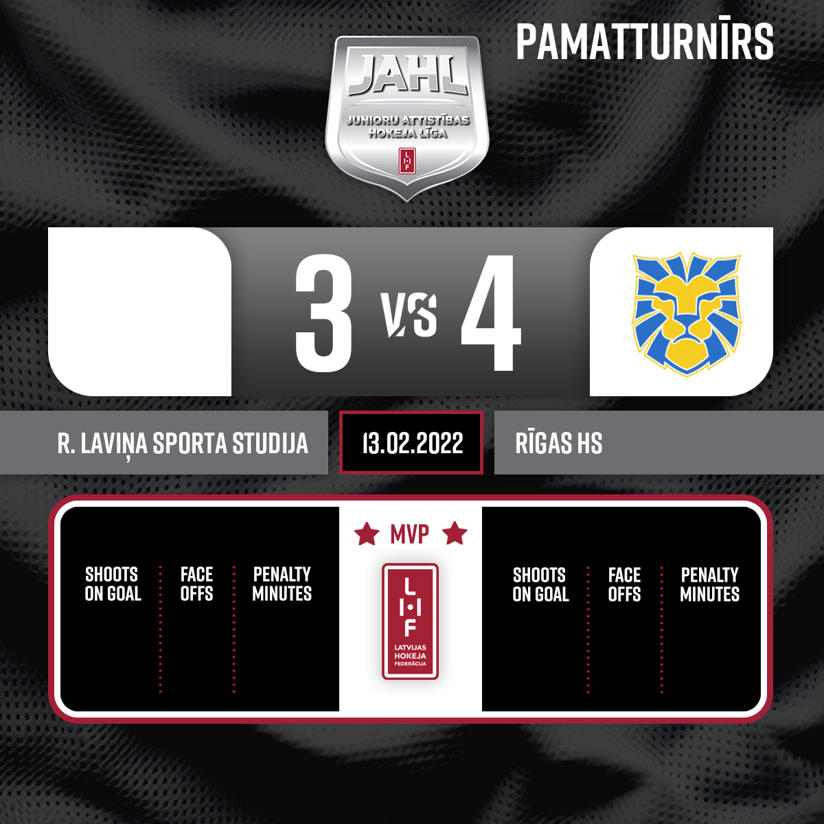 Vārti#55 Kristers ANSONSPiespēles: #48 Raivis STRAZDIŅŠ, #35 Toms MOTS - 23:262.PAbas komandas spēlē pilnos sastāvos.