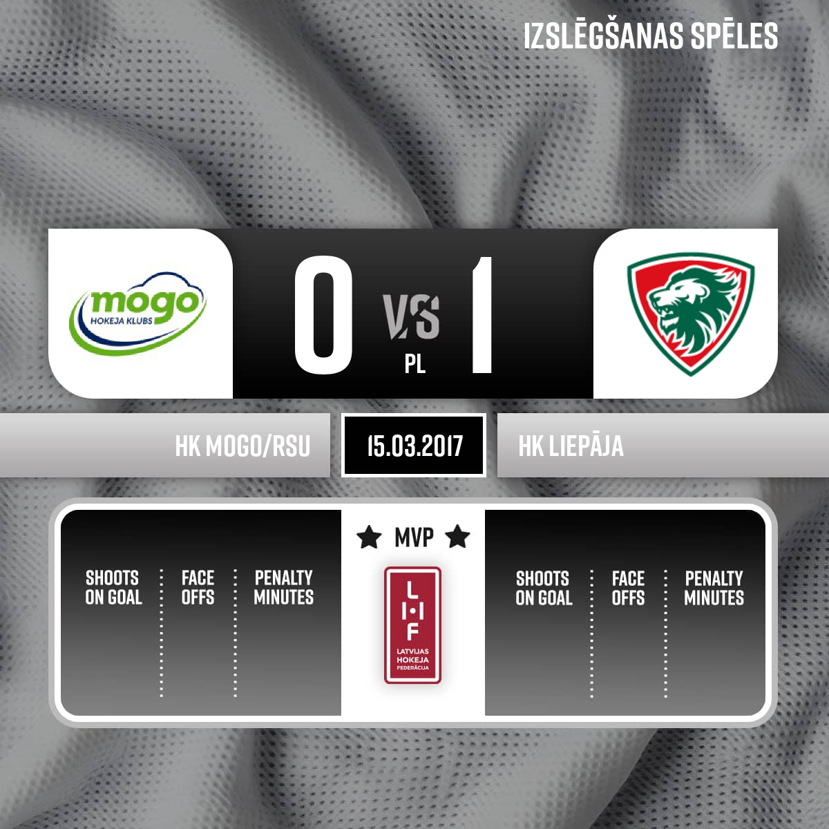 - 60:50PLMetienu attiecība: Liepāja 34 Mogo 29