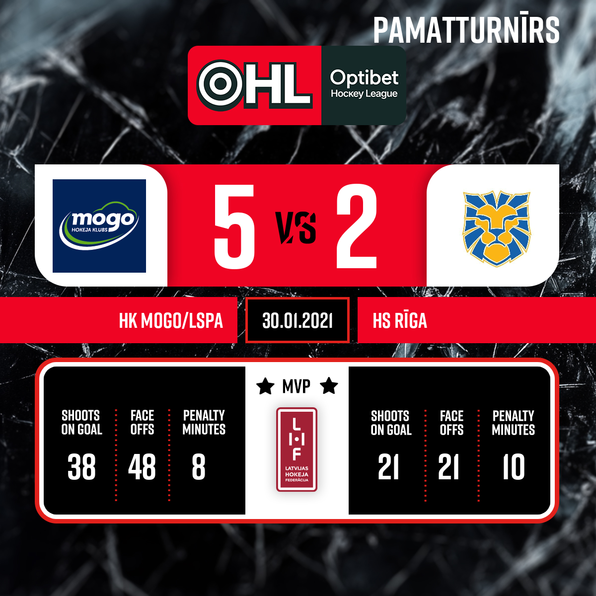 - 60:003.PSpēles labākie spēlētāji: HS Rīga - # 41 Laviņš Martins Rodrigo HK Mogo/LSPA - # 33 Ančs Henrijs