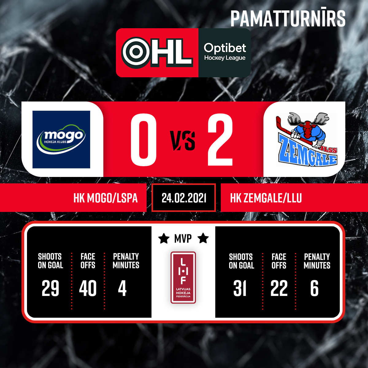 Noraidījums - 2 minūtesSpēles laika vilcināšana, #33 Henrijs ANČS - 00:001.PSpēles tiesneši: galvenie tiesneši - Elvijs TRANKALIS un Gints ZVIEDRĪTIS līnijtiesneši - Agris OZOLIŅŠ un Dāvis ZUNDE Spēles inspektors - Aleksandrs BORISOVS
