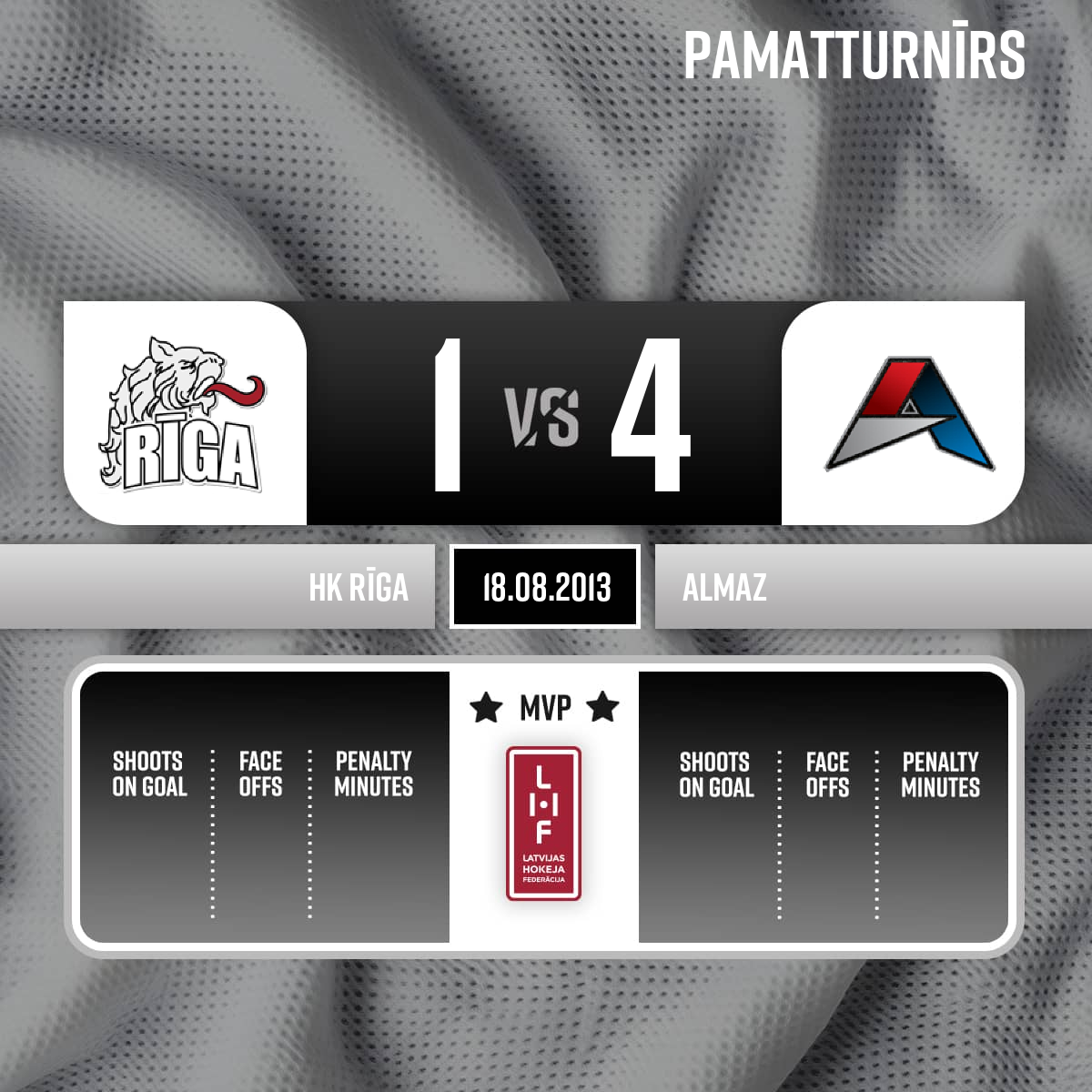 Vārti vairākumā#63 Denis BUHALCEVPiespēles: #25 Vadim KUDAKO, #79 Artem PERSHIN+1 vair. Almaz: 25, 79, 63, 94, 28 HK Rīga: 50; 67, 4, 20, 26 - 42:453.P