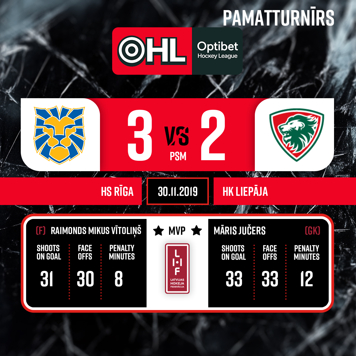 - 65:00PLLabākie spēlētāji: HS RĪGA #8 Raimonds Mikus Vītoliņš HK LIEPĀJA #35 Māris Jučers