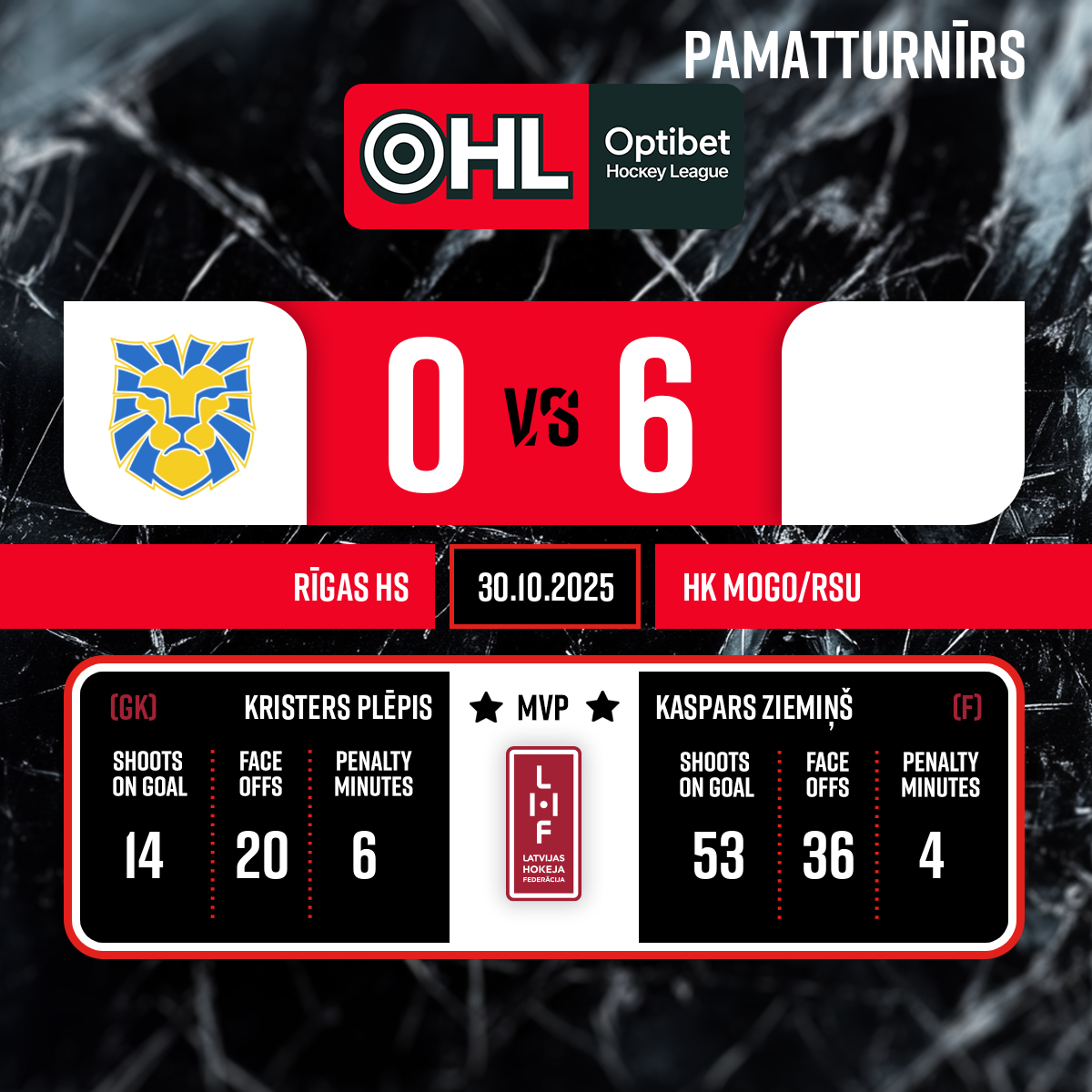 Vārti#18 Ingus LOČMELISPiespēles: #26 Ernests KRŪMS, #8 Artemijs ORLOVS - 40:00 3. perioda sākums