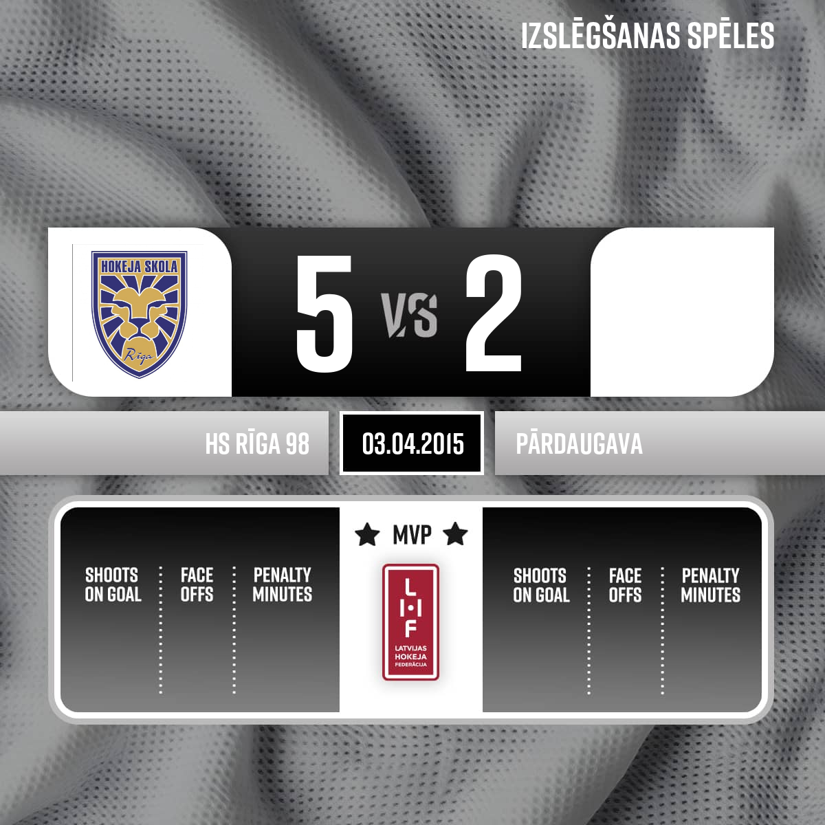 Vārti#14 Valters APFELBAUMSPiespēles: #11 Verners EGLE, #3 Rihards Ričards STINKURS - 09:481.PNoraidījums - 2 minūtesPretinieka turēšana ar nūju, #5 Vadims ADOŅJEVS