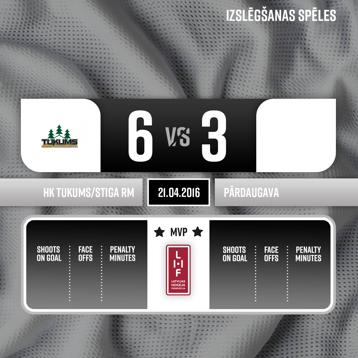 Vārti#44 Aigars VILMANISvienādos = - 00:001.PLabvakar! Cīņa par 3.vietu starp komandām HK Tukums/Stiga RM un Prizma/Pārdaugava ir sākusies! Spēli tiesā: Galvenais tiesnesis - Jevgēņijs Griškēvičs; Līnijtiesneši - Andrejs Jakovļevs un Ģirts Vasiļjevs