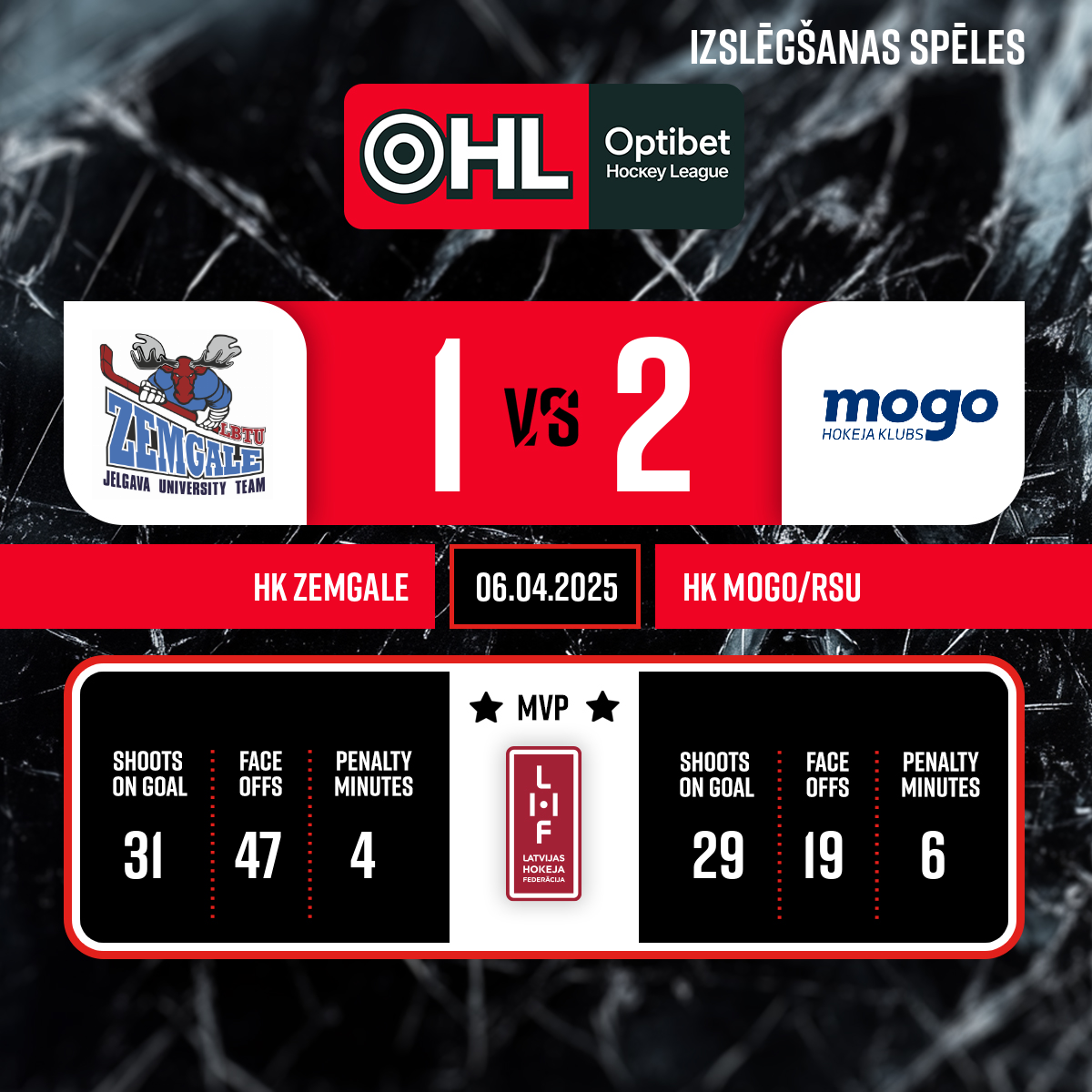 Noraidījums - 2 minūtesSimulācija/pietēlošana, #88 Rūdolfs MASLOVSKIS - 00:001.PSpēles tiesneši- Galvenie tiesneši- Uldis Bušs, Agris Ozoliņš līnijtiesneši- Voldemārs Rava, Dāvis Zunde