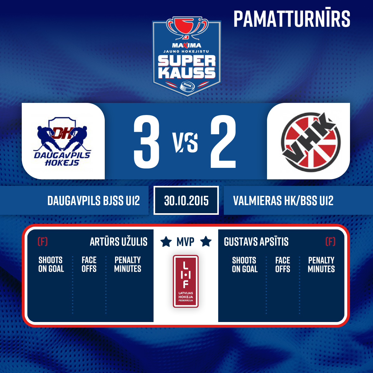 Spēles labākie spēlētāji: Daugavpils BJSS - #30 Artūrs Užulis, VAlmieras HK/BSS - #87 Gustavs Apsītis.