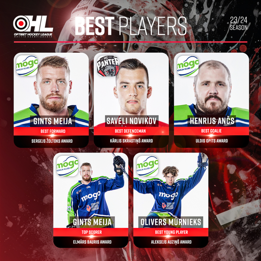 Sergeja Žoltoka (labākais uzbrucējs) un Elmāra Baura (rezultatīvākais līgas spēlētājs) apbalvojumos saņēma “MOGO/LSPA” pārstāvis Gints Meija. 36 gadus vecais hokejists šīs sezonas 27 OHL spēlēs guva 24 vārtus un veica 26 rezultatīvas piespēles.