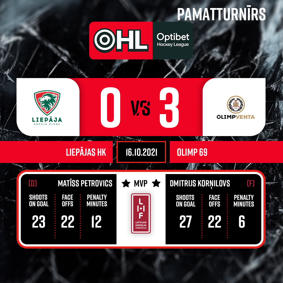 Spēles labākie spēlētāji - HK Liepāja Nr.24 Matīss Petrovics Olimp/Venta 2002 Nr.17 Dmitrijs Korņilovs