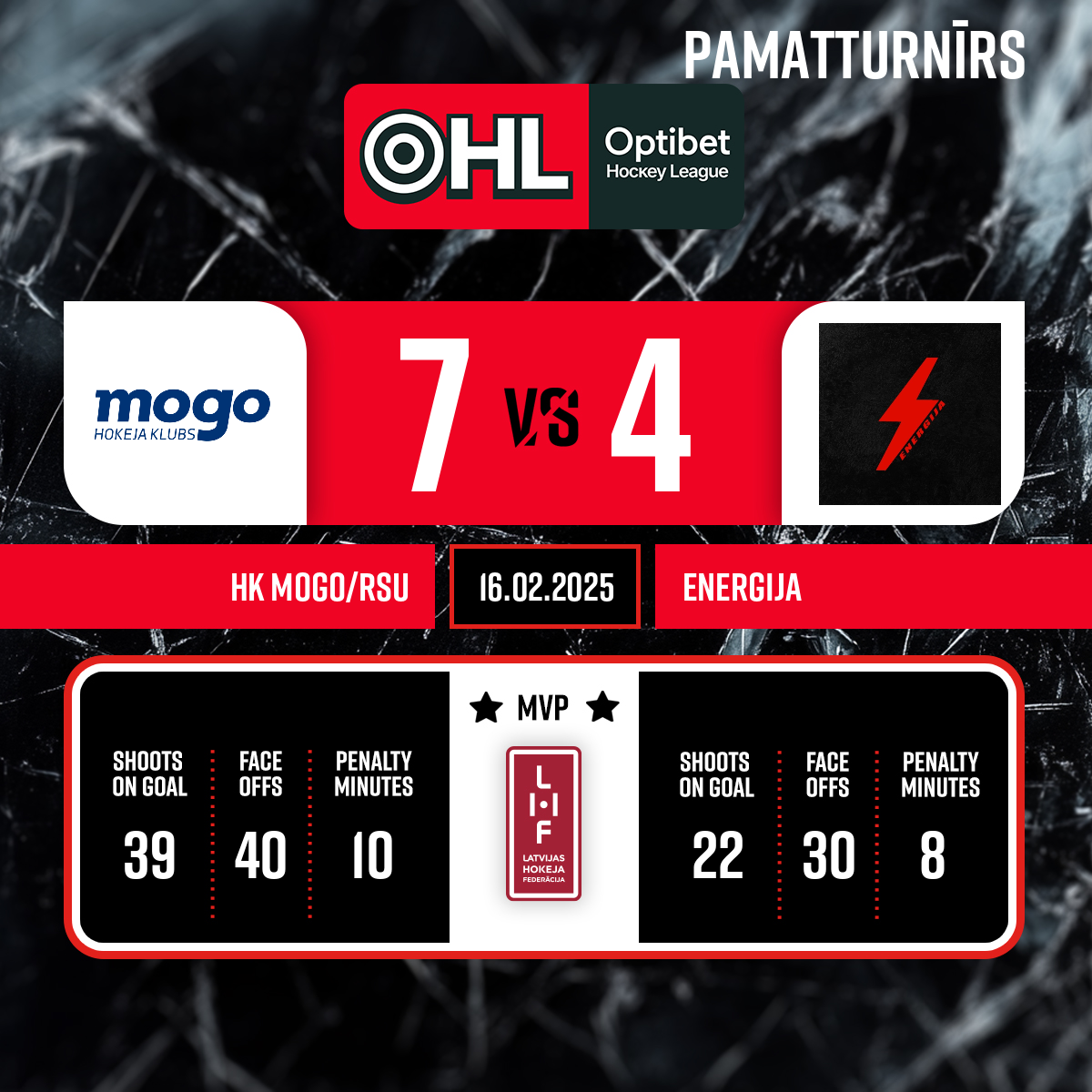 Spēles labākie spēlētāji: HK MOGO/RSU komandā Nr. 44 SPRUKTS Gatis ENERGIJA komandā Nr. 2 RUMŠEVIČIUS Paulius