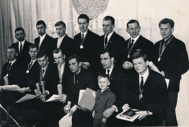1955. gada Latvijas PSR čempionāta finālturnīrā 6 komandas (3 no Rīgas un pa 1 no Cēsīm, Talsiem un Liepājas) izspēlēja vienu apli, un par čempioniem kļuva Rīgas LOKOMOTĪVE. Attēlā: 1955. gada LPSR čempioni Rīgas LOKOMOTĪVE - no kreisās: spēlējošais treneris A. Auziņš, I. Janeks, A. Jankavs, V. Mencēns, A. Šteinbergs, K. Sniedze, A. Leja, R. Šmits, P. Ramans, E. Ozoliņš, H. Kurmelis, I. Baltiņš, H. Dumpis, G. Detlavs (foto: M. Treizons).